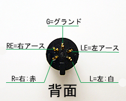 正面から見て上中心の部分がG=グランドになりまして、左側がL=左、右側がR=右になります。ハンダ付け作業を行う場合は、背面の写真の通りに結線を行います。R=赤又L=白と明記しましたのは、RCAプラグL・R(左・右)の音声極性の分け方になります。