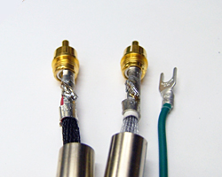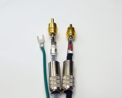 ケーブルのシールドをRCAプラグのマイナス側にハンダ付けを行います。アース線にY端子(1.25Y-4)を取り付けます。写真ではスミチューブAタイプの透明をケーブルと端子の接続部分に使用しています。最後にRCAカバーも締めこんで出来上がりです。