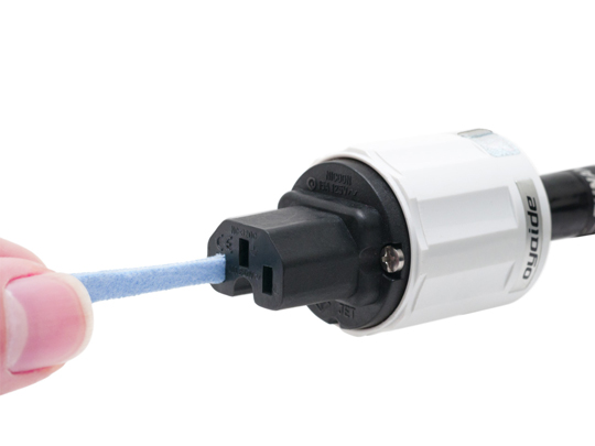 Many audiophiles already know that the quality of power supply accessories such as audio wall outlets, power cables, and power strips greatly affects the sound quality of audio playback. However, if the electrodes of these power supply accessories are dirty, contact resistance increases and noise is generated, resulting in a significant degradation of sound quality. However, the electrodes of these power supply accessories are often located deep in the slit-like insertion holes, making them difficult to clean. In addition, the oxide film, which is the main cause of contamination, is difficult to remove with conventional cleaning solutions and contact revival agents.