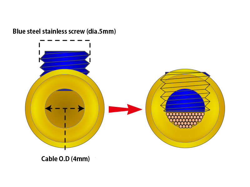 Dual screw clamp method is used for connection. The cable and main body are securely contacted and fixed with two screws. Furthermore, the screws used to secure the cable are also carefully designed. A highly rigid stainless steel set screw with a diameter of 5mm is used for the 4mm-diameter cable penetration area. This eliminates the gap between the main body and the screw part and secures the maximum contact area.