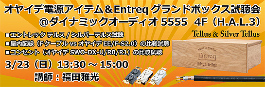 - ダイナミックオーディオ5555H.A.L.3にて、3/23(日)13:30-15:00に「福田雅光 電源&アースを斬る!」と題した試聴イベントを実施します。講師はオーディオ評論家の福田雅光先生で、Entreq社Tellus/SilverTelusと、オヤイデ電気の電源アクセサリー関連の解説と試聴を行います。