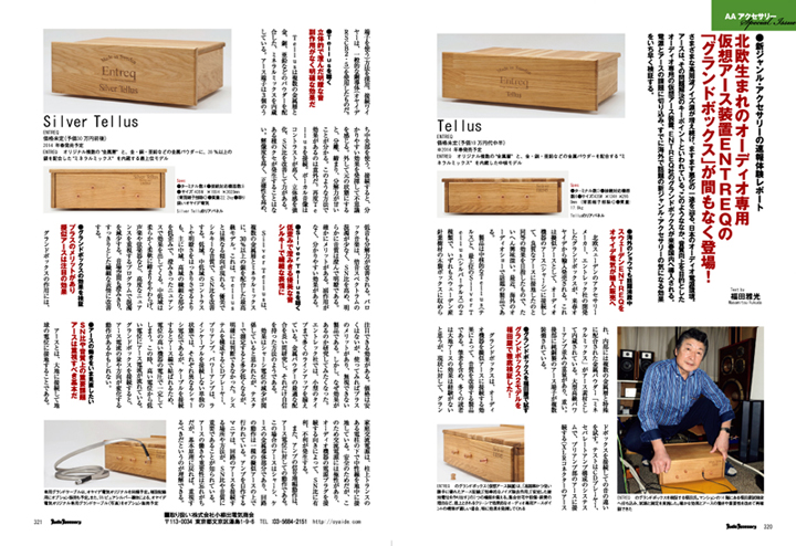 - 音元出版の季刊オーディオアクセサリー151号(2013年冬号)320-321ページに、Entreq社Tellus/SilverTelusの試聴レポートが掲載されました。評論はオーディオ評論家の福田雅光先生。2014年11月21発売。