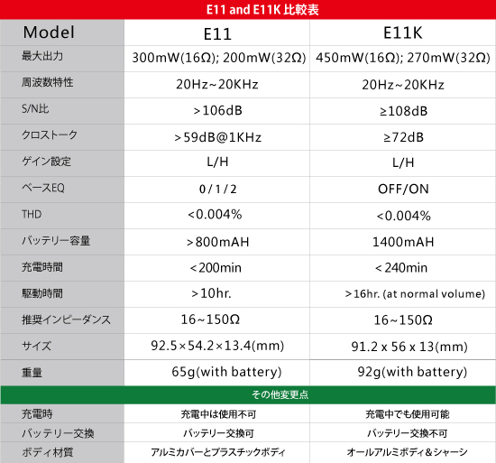 - 最大出力がE11 の300mW から1.5 倍の450mW へ増大(16Ω時)