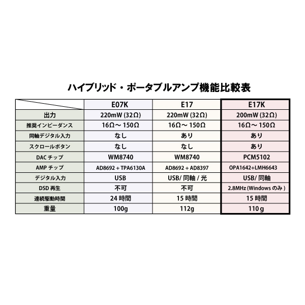 | サンプルレート | [USB] PCM: 32/44.1/48/96 KHz DSD: 2.8MHz |