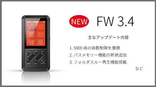 - パスメモリー機能を新規追加しました。メインメニューの再生中カーソルから再生中画面に行った場合、以前はバックボタン(右上)を押すとメインメニューに戻る仕様でしたが、FW3.4から現在選択されている曲のフォルダ/アルバム/アーティスト/その他に移動する仕様になりました。