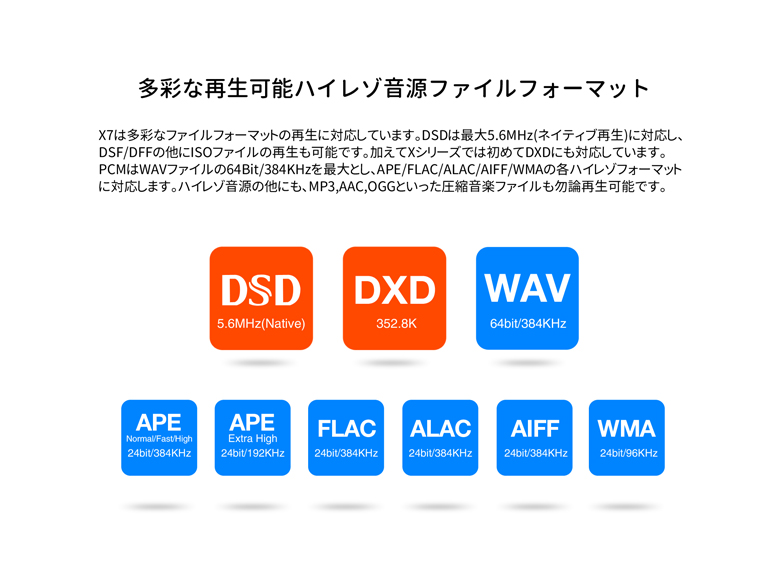 DSD: ネイティブ最大5.6M (".dsf"/".dff"/".iso") DXD: 352.8KHz AIFF: max 24Bit/384KHz FLAC: max 24Bit/384KHz WAV: max 32Bit/384KHz ALAC: max 24Bit/384KHz WMA: max 24Bit/96KHz APE Fast/Normal/High: max 24Bit/384KHz APE ExHigh: max 24Bit/192KHz APE Insane: max 24Bit/48KHz |