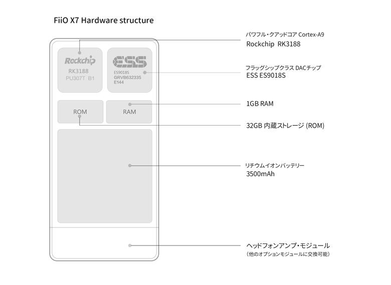 | チップ構成 | SoC: RK3188 DAC: AK4490EN x 2 LPF: OPA1642 x 2 OPamp: カスタムOPA426 x 2 |