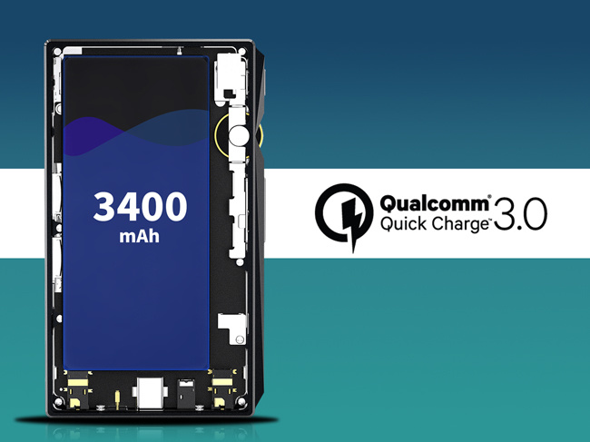 X5 3rd generationは3.8V/3400mAhのバッテリーを内蔵し、約10時間連続で再生駆動させることが可能です。また新たにQualcomm® Quick Charge 3.0に対応。通常のUSB 5Vでの充電に加え、9Vまたは12Vのハイボルテージで出力可能な充電器を使用することにより、フル充電までに要する時間を大幅に短縮することが可能です。(最大電流1.2Cの場合、約90分で空の状態から満充電)