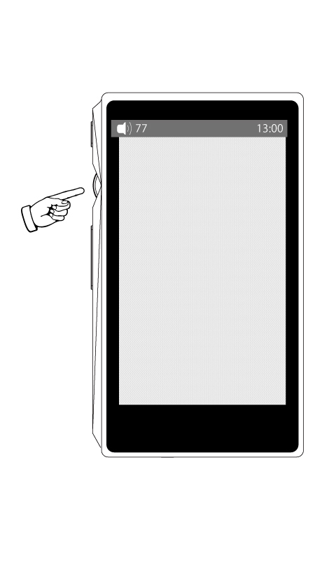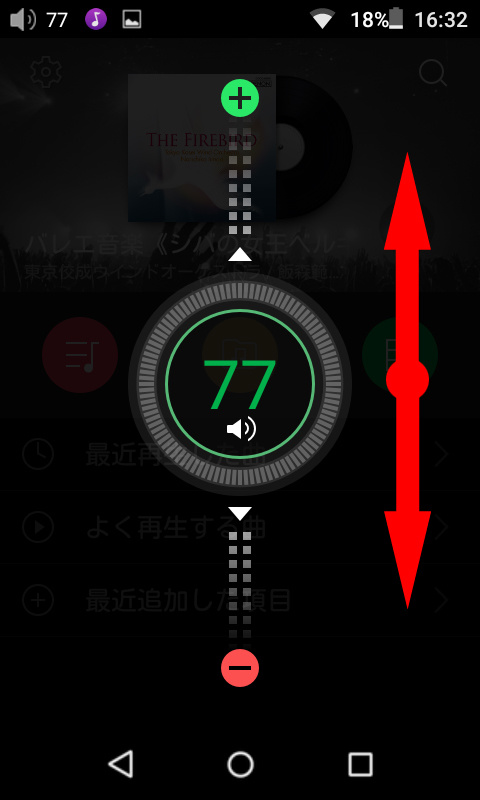 本体左上部のボリュームダイヤルを動かすと音量の調整ができますが、音量画面表示中に画面をタッチして上下にスワイプすると、より大きい範囲での調整をすることが可能となります。