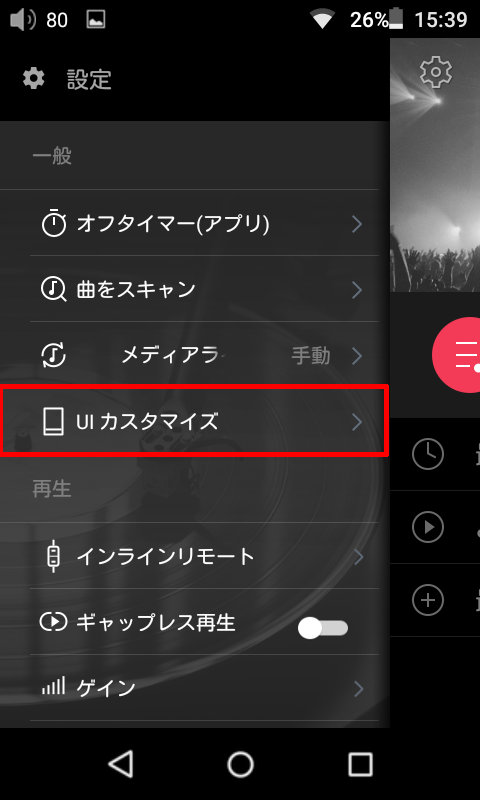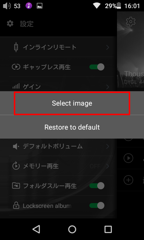 2. メインメニュー左上の設定画面を開き、「Customize album art image」をクリックします。