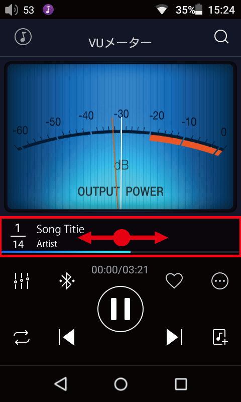 A. 再生中画面で、下画像赤枠内の曲名/アーティスト名が表示されている部分をタッチして左右に動かすとシークバーが移動し、曲の早送り/巻き戻しをすることが出来ます。