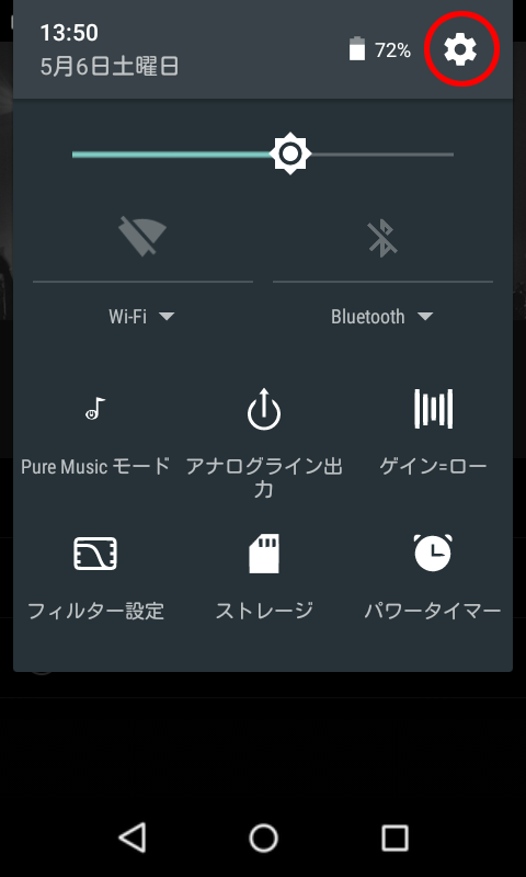 1. Pure Musicモードでは、画面上部の音量や時間などが表示されているバーを下に2回スワイプして設定画面を表示し、下画像赤丸内のギア状のアイコンをクリックして本体設定画面を呼び出します。