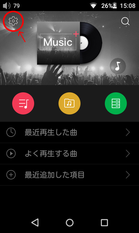 1. Pure Musicで、画面左上部のギア状のアイコンをクリックして設定画面を呼び出します。
