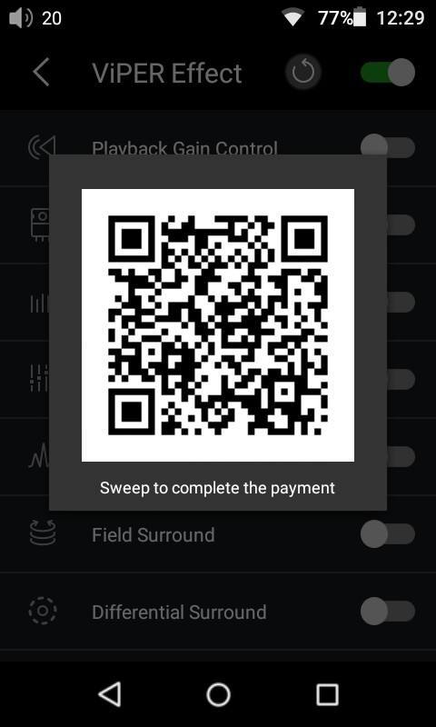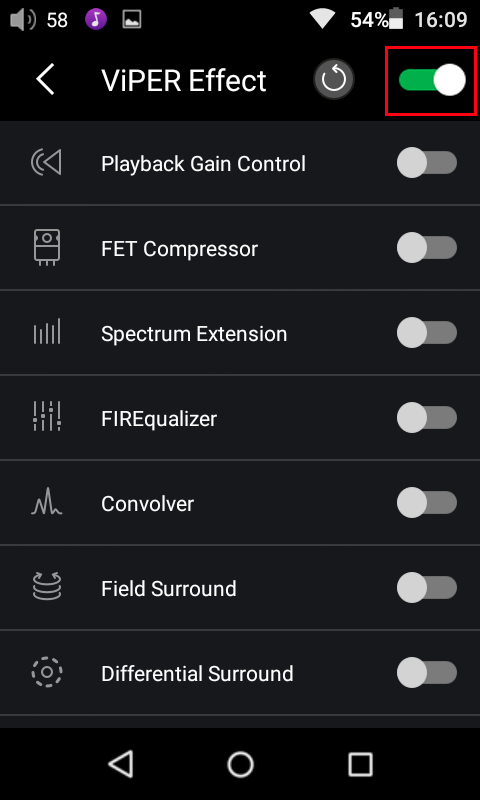 3. ViPER Effectの設定画面が呼び出されたら、下画像の右上部の赤枠内に表示されているトグルスイッチを右にスワイプしてエフェクト自体を有効にします。