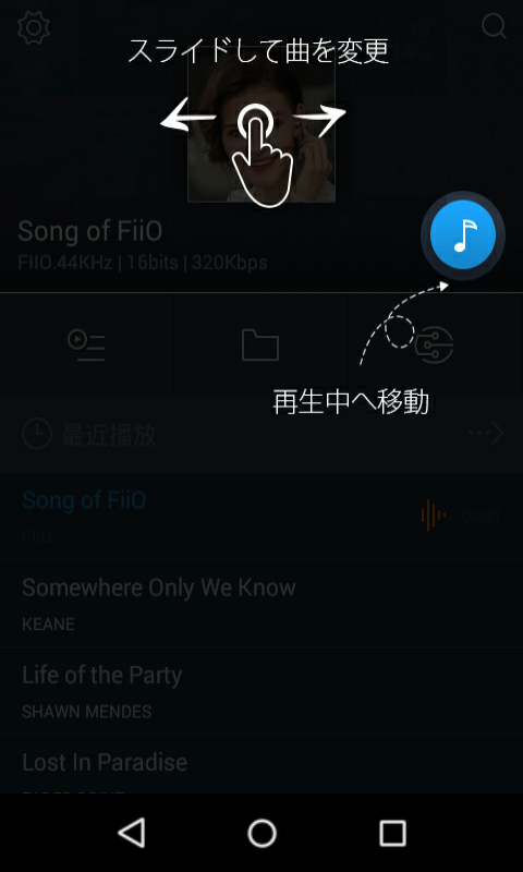 FiiO Music アプリは、FiiO社が本機専用に独自開発した標準搭載の音楽再生アプリです。Pure Music モードではFiiO Music アプリの機能のみに限定され、Androidモードでもアプリとして立ち上げることにより使用可能となります。