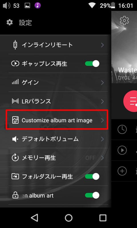 2. メインメニュー左上の設定画面を開き、「Customize album art image」をクリックします。