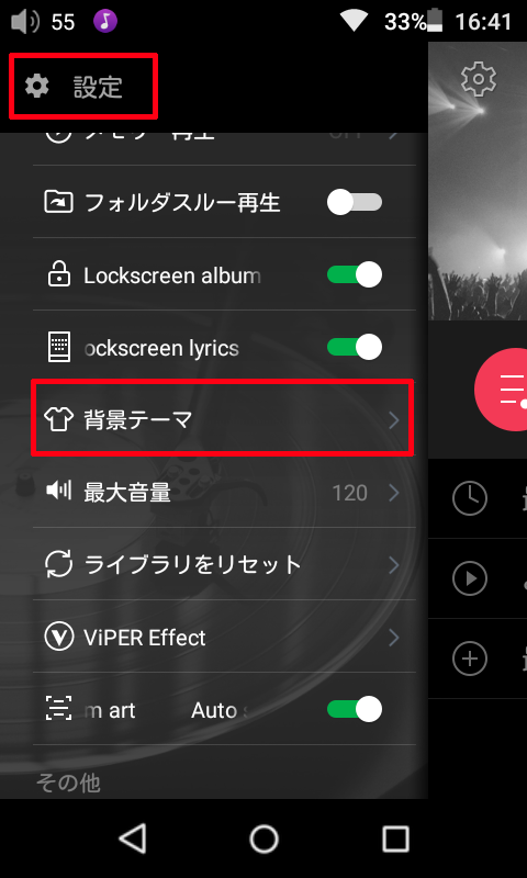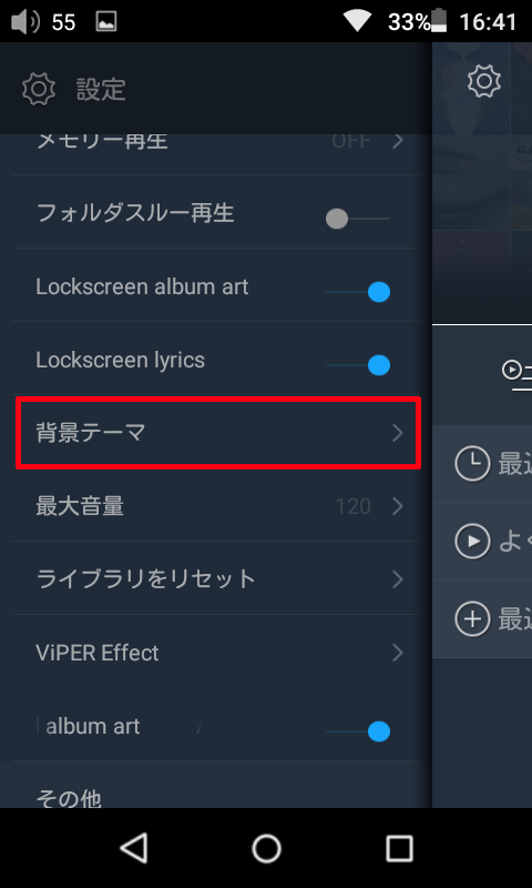 1. FiiO Music でメインメニュー左上部のギア状のアイコンからアプリの設定画面を開き、「背景テーマ」をクリックします。