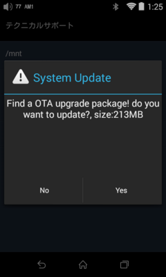 3.X7がAndroidモードの状態でホーム画面の”Support”をクリック後、左上の”Update”を選択し、ダウンロードしたファームウェアのzipファイルが入っているディレクトリ(external_sd)または(internal_sd)をクリックし、X7のアップデート用zipファイルを選択すると、以下のダイアローグが表示されます。
